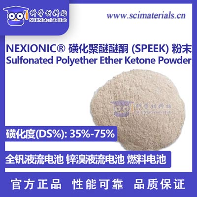 NEXIONIC® 磺化聚醚醚酮(SPEEK)粉末(Sulfonated Polyether Ether Ketone,磺化聚醚醚酮)粉末是一种高性能非氟离子交换材料,由 PEEK 主链经磺化反应制备而成。其磺化度可控,具有优异的离子传导性、耐化学腐蚀性和良好的机械性能,适用于膜材料制备、复合电解质以及电化学研究。
