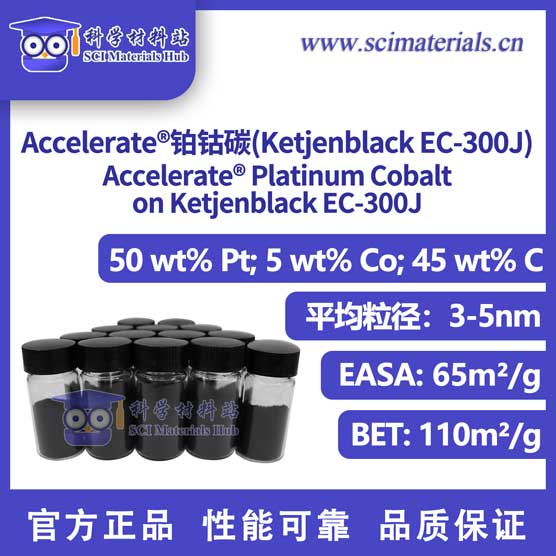 Accelerate® 55% Pt₃Co / Ketjenblack EC-300J 铂钴碳催化剂采用高比表面积 Ketjenblack EC-300J 碳载体负载铂钴合金(Pt₃Co),金属颗粒均匀分散,平均粒径3-5nm。该催化剂在质子交换膜燃料电池(PEMFC)中表现出优异的电化学活性和高质量比活性(MA),同时适用于氢气氧化或氧还原反应的电极材料开发。