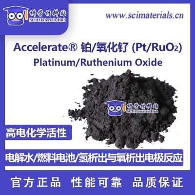 Accelerate® 铂/氧化钌 (Pt/RuO₂) 电催化剂采用高分散性贵金属铂 (Pt) 与氧化钌 (RuO₂) 复合制备,兼具优异的电化学活性与化学稳定性。